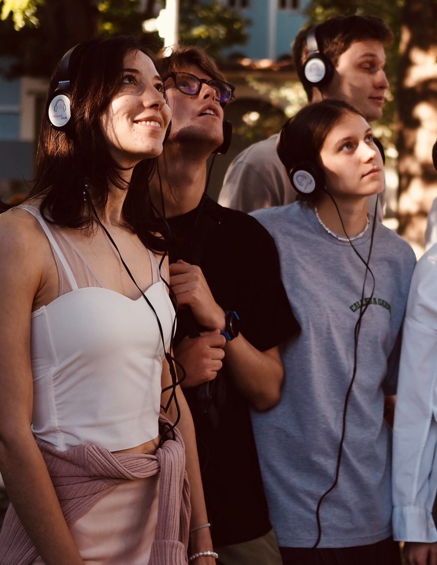 The tour is a walking experience. Along the route, in addition to the actors, there is a technician who provides instructions, hands out headphones, manages transitions between locations, assists in finding the best vantage points, and addresses any technical issues.